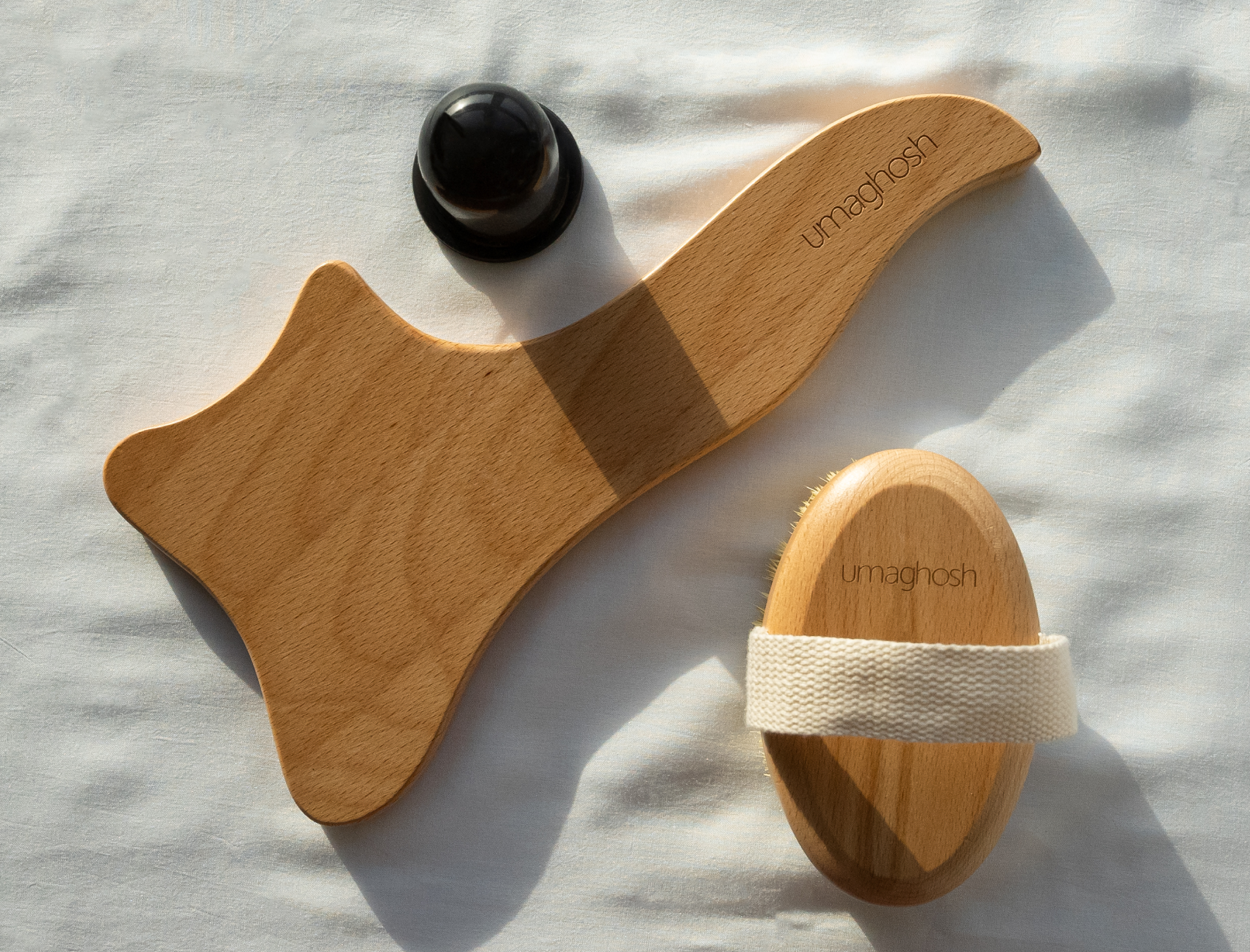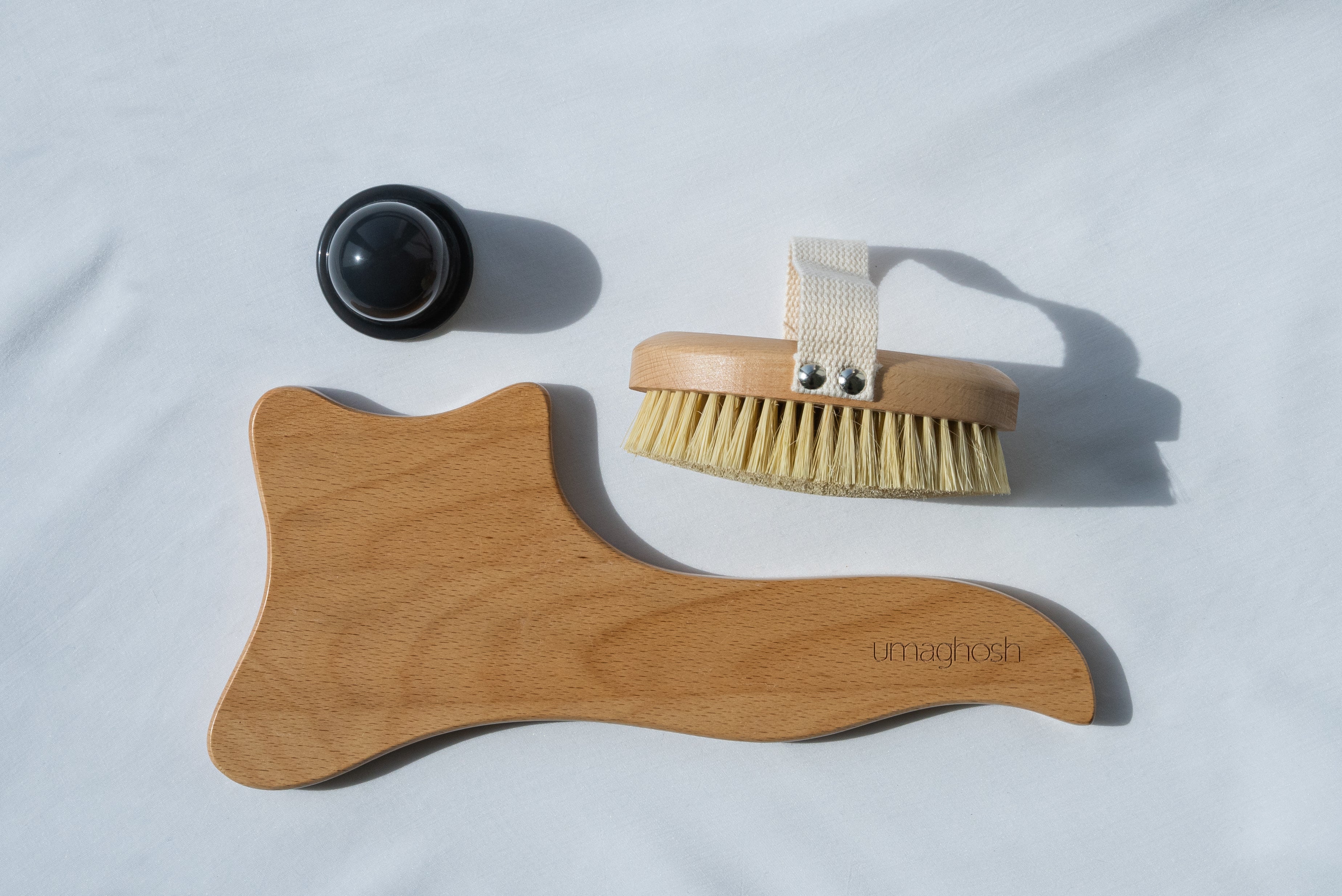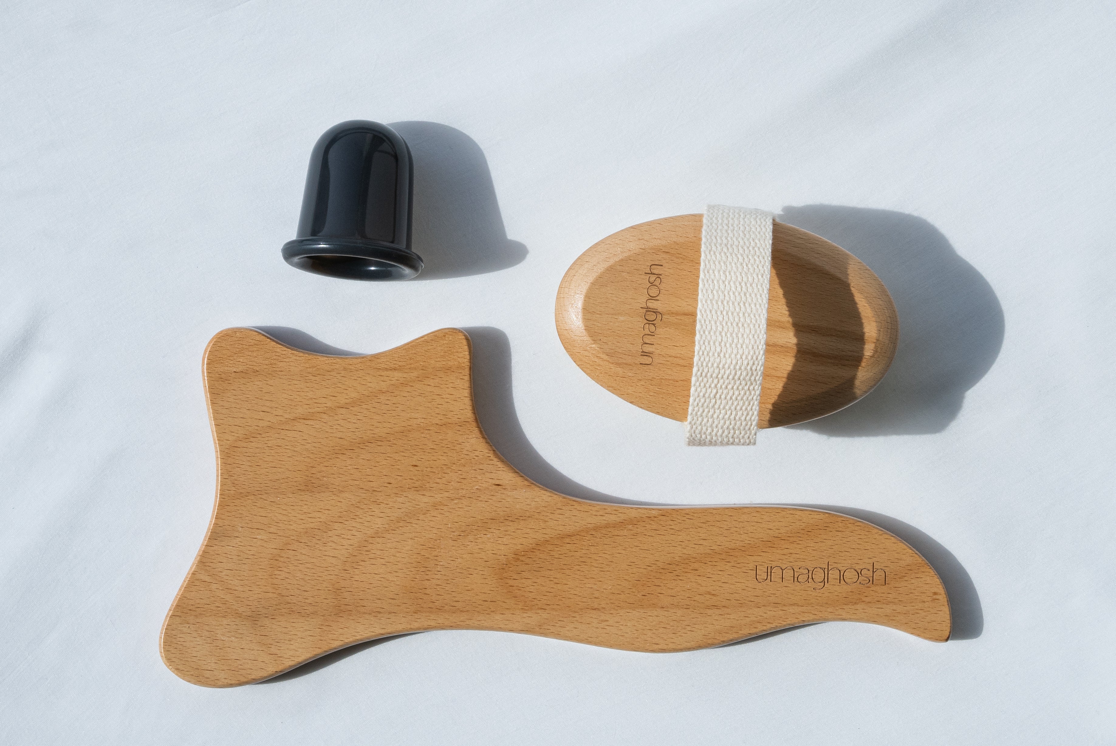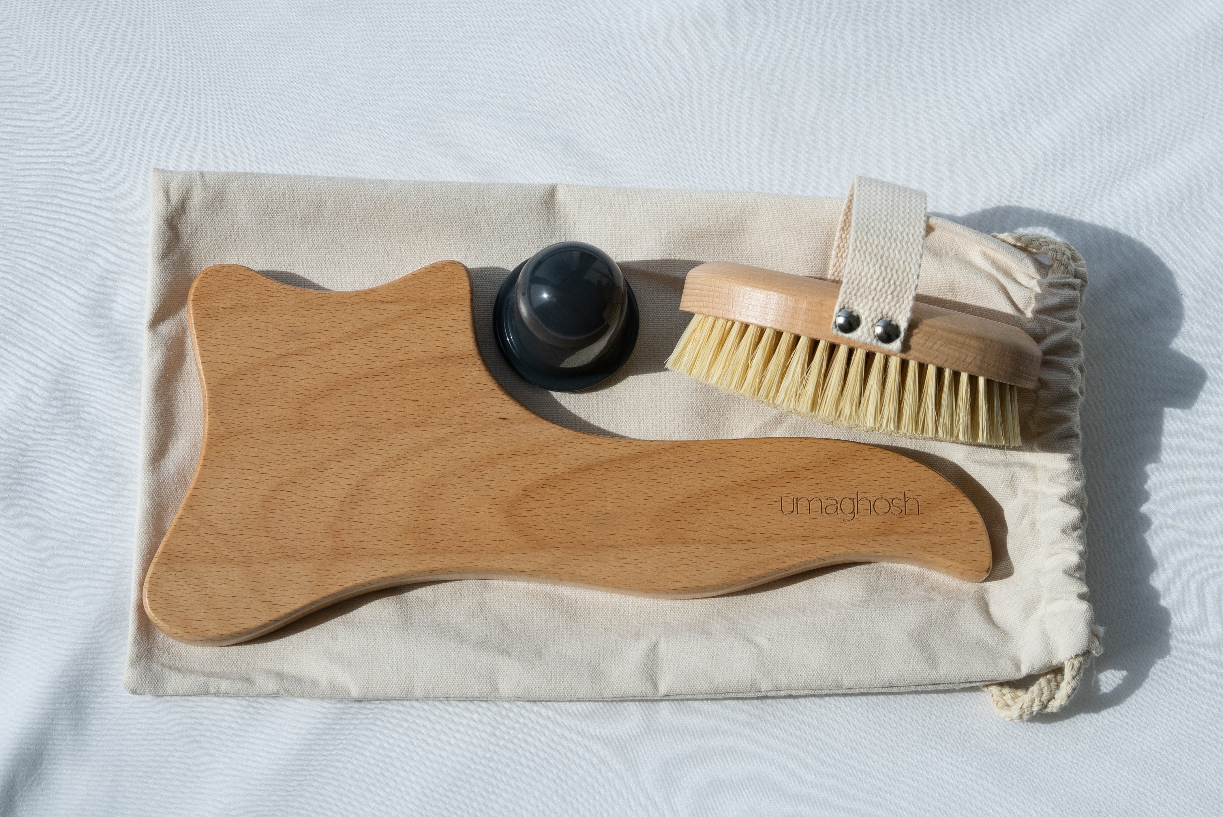 We are introducing a combination of dry brush, scraping tool and facial cup. A power pack, also known as a cellulite kit. If used correctly, it can diminish the signs of cellulite.